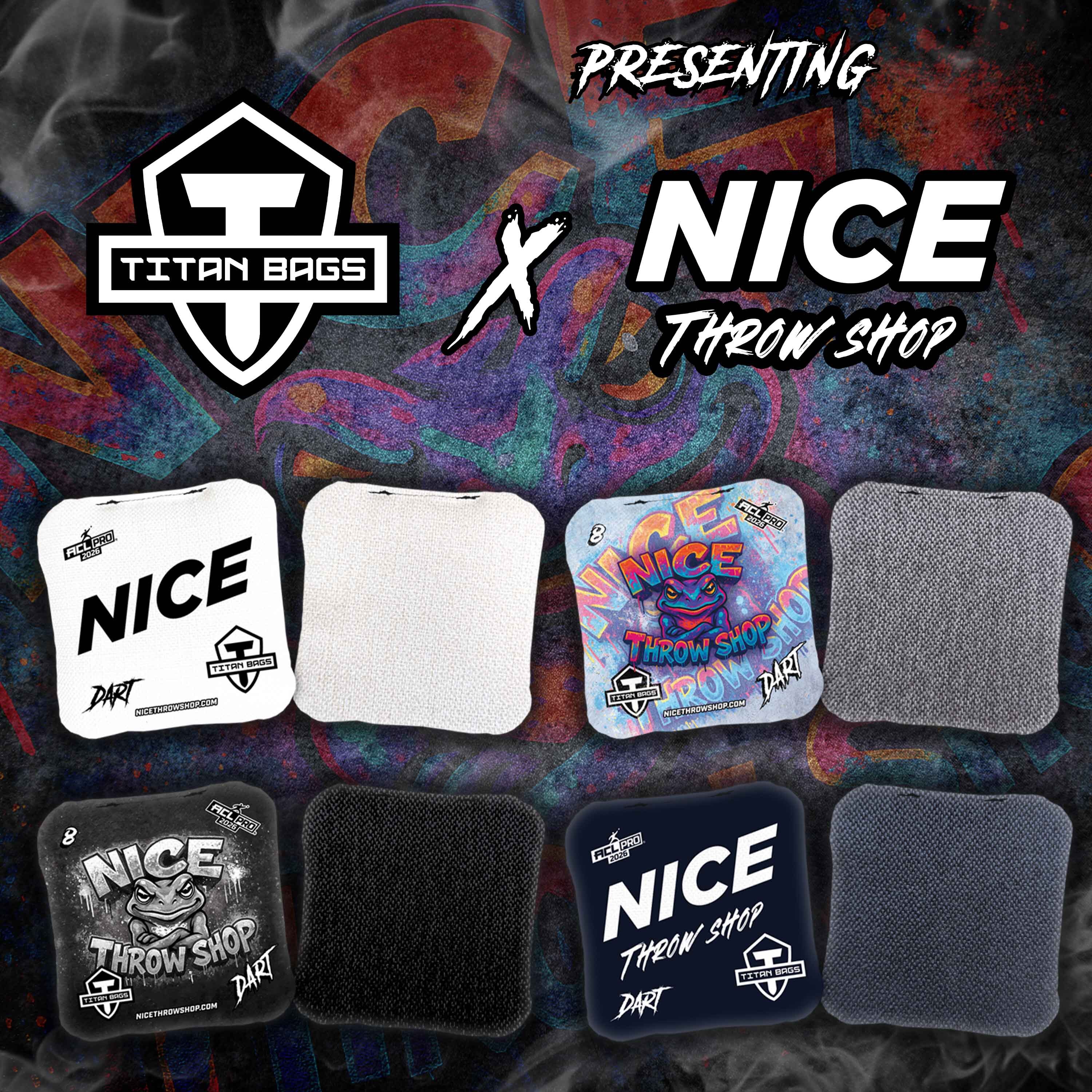 NICE Throw Shop x Titan | Dart - NICE NICE Throw Shop x Titan Dart Cornhole Bags – Collab Edition The Dart is back with a fresh new style in this exclusive collaboration between NICE Throw Shop and Titan Bags. This co-branded design delivers the same trusted Dart performance with a... MSRP: Was: Now: $99.99 Choose Options